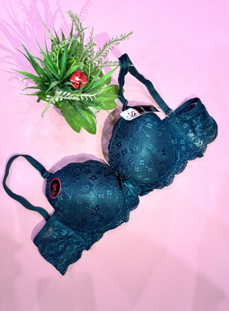 Add a touch of elegance to your everyday wear with this beautifully designed teal lace bra. Crafted with soft lace fabric and padded cups for gentle lift and support, it ensures all-day comfort and a flattering silhouette. The adjustable straps and underwire design provide a secure fit, while the scalloped lace edges give it a feminine, stylish finish. Perfect for both daily wear and special occasions.