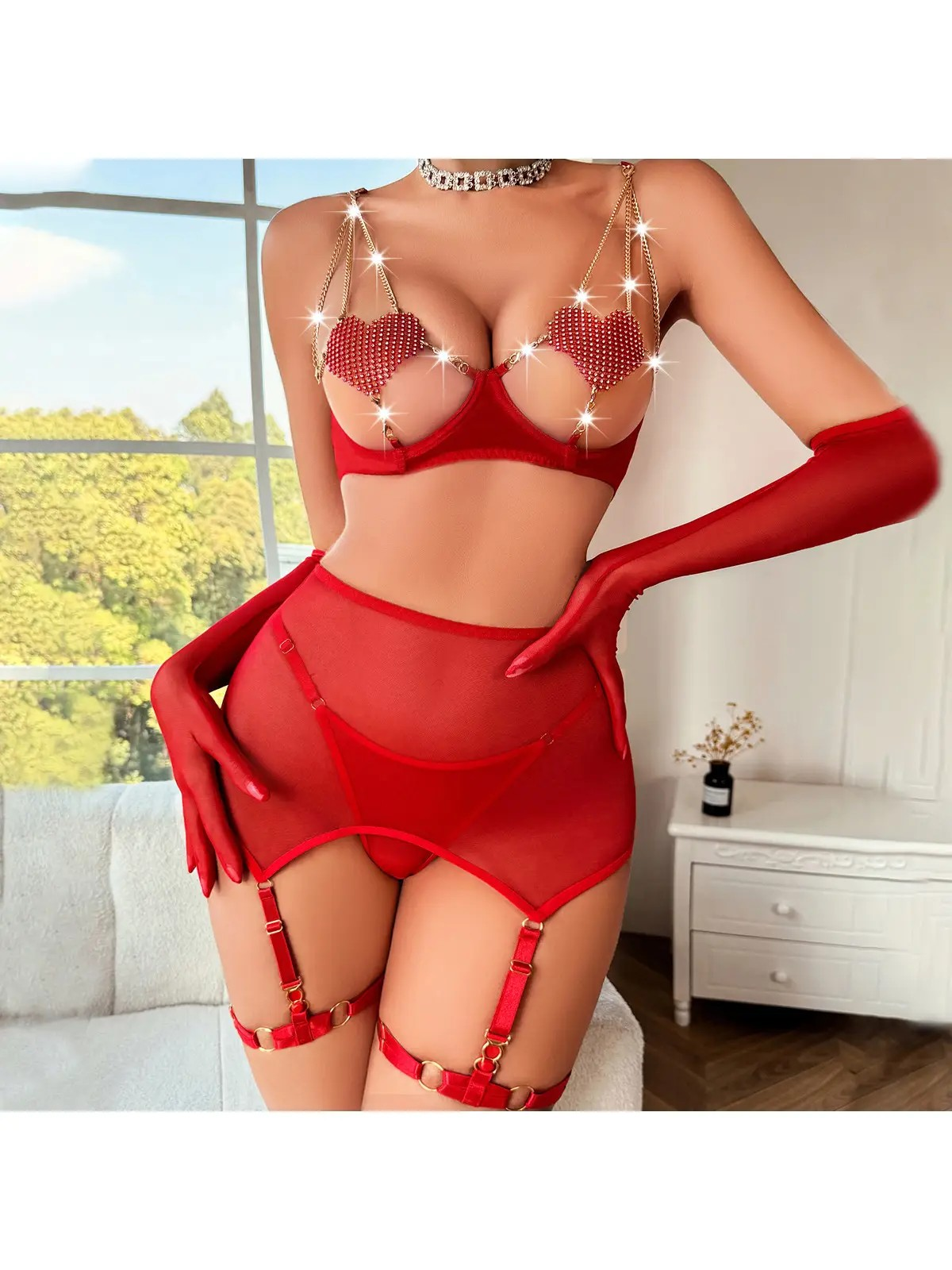 New Fashion Sexy Lingerie Sets Erotic Mesh Open Chest Love Chain Underwear for Women High Quality